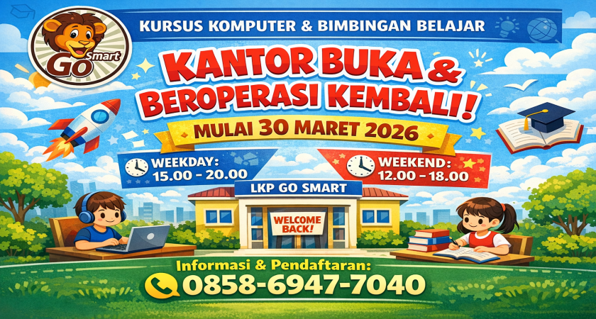 Mulai 30 Maret 2026, LKP Go Smart kembali aktif melayani peserta didik dengan suasana belajar yang menyenangkan, fasilitas yang memadai, serta pengajar yang berpengalaman.